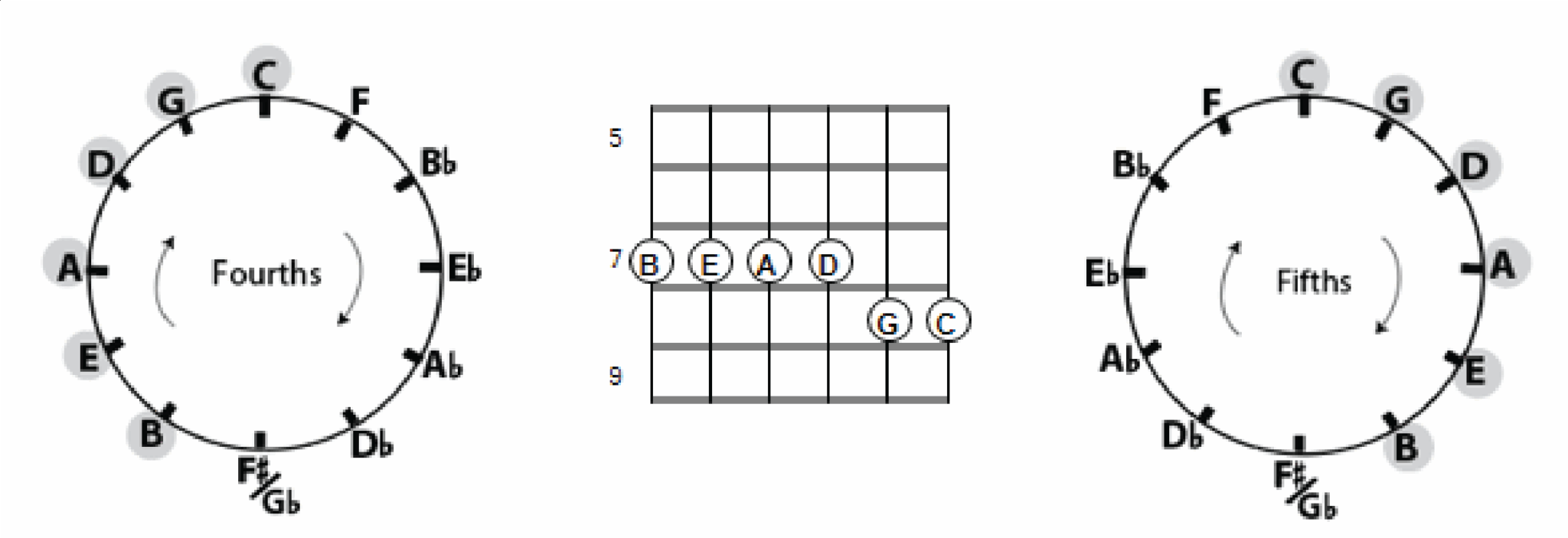 Because fifths are inversions of fourths, the reverse applies when locating notes on lower strings.